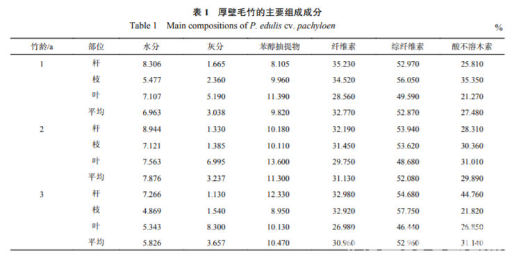 竹材是速生型植物資源,具有生長快、易繁 殖、產(chǎn)量高、再生能力強(qiáng)等特點(diǎn),通過合理間 伐,可永續(xù)利用,是理想的代木材料。厚壁毛竹 ( Phyllostachys edulis cv. pachyloen) 是 20 世 紀(jì) 80 年代發(fā)現(xiàn)的一種毛竹變種,其稈略呈四方 形,稈壁率是毛竹的 2.0 倍,胸徑部位絕對(duì)厚度 可達(dá) 2.5 cm 以上,是等徑毛竹的 1.8 倍,出材率 比一般的毛竹要高,具有較高的研究和應(yīng)用價(jià) 值。目前,厚壁毛竹在生物質(zhì)能源及化學(xué)品等高 值化應(yīng)用尚處于起步階段,其化學(xué)成分的類別 和含量直接影響厚壁毛竹材性和利用價(jià)值,尤其 對(duì)人造板應(yīng)用和制漿造紙影響較大。有研究指 出,不同年份和不同部位厚壁毛竹的主要成分含 量具有較大的差異性。基于此,本研究以 1 年 生、2 年生、5 年生厚壁毛竹為對(duì)象,研究其中 稈、枝、葉部位不同部位化學(xué)成分類別和含量變 化規(guī)律,以期為厚壁毛竹的合理利用提供參考。