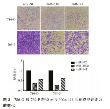前一晚用空白 1640 培養基稀釋基質膠,將稀 釋好的基質膠溶液加到 Transwell 小室中,第 2 天 吸去 Transwell 小室中液體,可見底部有一層白色 薄膜,即凝固的基質膠,Transwell 小室下加入 600 μL 1640 完全培養基? 786-O 和 769-P 細胞接種于 6 孔板中,基于 1640 培養基體積計算濃度,加入終濃度為 2.5 μmol·L-1 地西他濱誘導 3 d 或轉染 miR-200c/141 2 d 后,0.05%胰蛋白酶消化計數, 10 000 個細胞每孔種于鋪好膠的 Transwell 小室 中?置于37 ℃,5% CO2的細胞培養箱中培養 24 h, 吸走培養基,PBS 洗 2 次,4%多聚甲醛固定 1 h, 棉簽拭去小室上層細胞,結晶紫染色 1 h,PBS 洗 2 次,用配有尼康數碼照相機的尼康倒置鏡像顯微 鏡進行拍照。