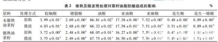 由表 2 可知,催熟雖然不會改變菜籽油的脂肪 酸組成,但在含量上存在較大差異( P < 0. 05) 。而 微波預處理則對脂肪酸組成及含量整體未產(chǎn)生顯著 影響( P > 0. 05) ,油酸、亞油酸等不飽和脂肪酸也較 為穩(wěn)定。Oomah 等對大麻籽進行不同程度的微波預處理,發(fā)現(xiàn)其脂肪酸組成無變化。吳雨等也 利用此手段加工米糠,結(jié)果表明米糠油脂肪酸組成 不受微波預處理的影響。