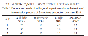 菌株活化:將菌株S3-1劃線于活化培養基,28 ℃倒置 培養3 d。種子培養:挑取活化培養基上的單菌落接種于裝 液量為50 mL/250 mL的種子培養基中,28 ℃、150 r/min條 件下培養至對數期。發酵培養:按6%(V/V)的接種量將種 子液接種于裝液量為40 mL/250 mL的基礎發酵培養基中, 28 ℃、150 r/min條件下培養84 h。參考楊文等的方法,采 用酸熱法進行破壁,丙酮進行提取,提取至菌體變白,合并 提取液,提取過程盡量避光。 在基礎發酵培養基的基礎上,分別考察碳源種類(葡 萄糖、果糖、蔗糖、木糖、乳糖、麥芽糖、可溶性淀粉、甘油) 及添加量(10 g/L、20 g/L、30 g/L、40 g/L、50 g/L、60 g/L)、氮 源種類(酵母浸粉、蛋白胨、玉米漿、酵母浸粉+蛋白胨)及 添加量(10 g/L、20 g/L、30 g/L、40 g/L、50 g/L、60 g/L)、硫酸 鎂添加量(0、0.3 g/L、0.6 g/L、0.9 g/L、1.2 g/L、1.5 g/L)、初始 pH值(5.0、5.5、6.0、6.5、7.0)對菌體生長和β-胡蘿卜素產量 的影響。根據β-胡蘿卜素的產量和純度篩選影響顯著的因 子和最佳水平,進行4因素3水平正交試驗,正交試驗因素 與水平見表1。