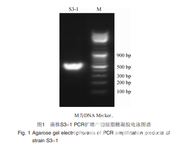 菌株S3-1的PCR擴增產物的電泳圖譜見圖1。由圖1可 知,PCR擴增產物堿基長度約為574 bp,與目的基因堿基長度相符,進行測序。