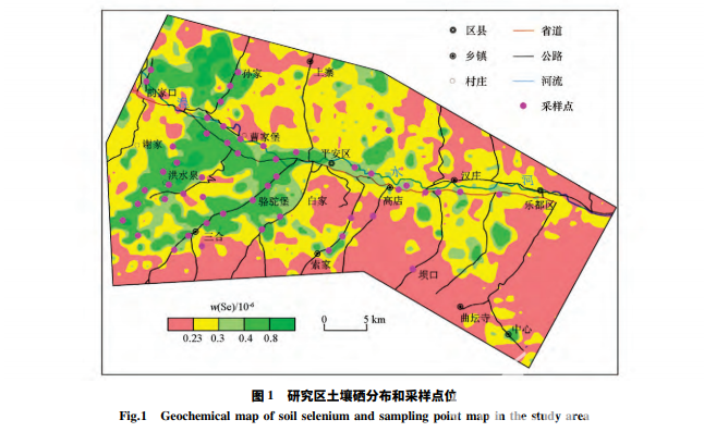 研究區(qū)耕地主要分布在湟水河及各支溝谷地兩 側(cè)。在研究區(qū)耕地中選擇典型富硒( Se≥0.4×10-6 ) 區(qū)和低硒區(qū)布設表層土壤樣品共 50 件,具體采樣點 位見圖 1。為保證樣品代表性,采取多點組合采樣 的方法,即在設計樣點位置選擇 1 個主點,并在同一 地塊中以“梅花法”選擇 3 ~ 4 個副點采集表層 0 ~ 20 cm 耕作層土樣,具體方法為用鐵鍬先挖采樣坑,然 后用竹片去除與金屬采樣器接觸的土壤,再采集所 需樣。每件樣品采集后須清除干凈工具上的泥土,將采集的樣品掰碎去除根系、石塊等雜物后將主副 點樣品混合,用四分法留取 1 ~ 1.5 kg 裝入布袋中, 同時記錄采樣點所處的土壤類型、成土母質(zhì)、土地利 用類型等信息。采集的樣品需陰干晾曬,過 20 目尼 龍篩取篩下物 200 g 裝袋封裝送至實驗室分析測 試。樣品測試由安徽省地質(zhì)實驗研究所承擔完成。 實驗室根據(jù)地質(zhì)礦產(chǎn)行業(yè)標準《多目標區(qū)域地球化 學調(diào)查規(guī)范( 1 ∶ 250 000) DZ /T0258-2014》、中國地 質(zhì)調(diào)查局《生態(tài)地球化學評價樣品分析技術要求 ( 試行) 》( DD2005-03) 、《生態(tài)地球化學評價樣品分 析外部檢查質(zhì)量控制暫行規(guī)定》和《生態(tài)地球化學評價樣品分析技術要求補充規(guī)定》等相關技術標 準,結(jié)合實驗室的實際情況采用國標提取方法,選用 實驗室最先進的分析儀器測試各項指標含量。將樣品放置于小于 60 ℃ 的恒溫干燥箱(上海精宏實驗設備有限公司)內(nèi)充分 烘干。稱取 10 g 烘干樣品,用 25 mL 趕凈二氧化碳 的水浸泡,用離子選擇性電極法( ISE) 測定 pH。分 取 10 g 干樣經(jīng)瑪瑙球磨機研磨至 200 目,在 750 ℃ 下艾斯卡半熔,熱水提取后分取提取液,加熱酸化, 硼氫化鉀還原,原子熒光法( AFS) 測定土壤總 Se。 分 取100g干樣經(jīng)瑪瑙球磨機研磨至1 0 0目,稱取 2.5 g 于 250 mL 聚乙烯燒杯中,加蒸餾水 25 mL,超 聲提取 30 min 離心分離,清液經(jīng) 0.45 μm 濾膜過濾, 原子熒光光譜法( AFS) 測定水溶態(tài) Se,殘渣經(jīng)水洗 后,棄去水相留下殘渣。