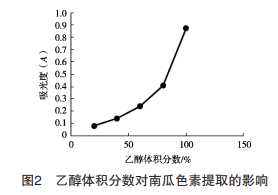 用6種不同的料液比對(duì)南瓜色素進(jìn)行提取,試驗(yàn) 結(jié)果如圖1所示。可看出南瓜色素的吸光度在0.1~0.3 之間,曲線呈下滑趨勢(shì),料液比越低,南瓜色素的提 取效果越好。料液比較低,曲線下滑很快,在1︰ 8~1︰12(g/mL)間處于較平穩(wěn)狀態(tài);料液比較高, 南瓜色素的吸光度繼續(xù)快速下降,考慮到試驗(yàn)的方便 性,可選擇1︰10(g/mL)的料液比作為南瓜色素提 取的條件。 用5種不同的乙醇體積分?jǐn)?shù)對(duì)南瓜色素進(jìn)行提 取,試驗(yàn)結(jié)果如圖2所示。可看出乙醇體積分?jǐn)?shù)對(duì)南 瓜色素的提取曲線呈上升趨勢(shì),且越來(lái)越陡,當(dāng)乙醇 體積分?jǐn)?shù)為100%時(shí)吸光度達(dá)到最大值,因此當(dāng)乙醇 體積分?jǐn)?shù)為20%,40%,60%和80%時(shí)南瓜色素的提 取效果均不好,無(wú)水乙醇效果最好。