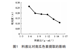稱取6份南瓜,每份5 g。其他條件相同時(shí),用體 積分?jǐn)?shù)95%乙醇,以不同料液比(1︰6,1︰8,1︰10,1︰12,1︰14和1︰16 g/mL)加入碎狀南瓜中, 將其放入50 ℃恒溫箱中浸提2 h。將得到的浸提液離 心后,稀釋到相同倍數(shù),在446 nm波長(zhǎng)下用7200可見(jiàn) 分光光度計(jì)分別測(cè)其吸光度。