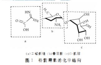 春雷霉素(Kasugamycin)又名春日霉素?加收米?加瑞農等,是由春日鏈霉菌(Streptomyceska-sugaensis)所產生的一種氨基糖苷類抗生素.春雷霉素作為農用殺菌劑,被廣泛應用于農業生產,不僅具有較好的防治植物疾病的效果,并且對人畜無毒害作用,無污染和無殘留符合現代環保要求,是目前最具推廣前景的綠色農藥之一,也是當前農作物病蟲害防治中具有廣闊發展前景的農藥之一.春雷霉素的結構由春雷胺(Kasugamine)?D-肌醇(D-inositol)和二碳側鏈(Two-carbonsidechain)共三部分組成,如圖1所示。