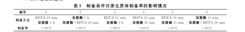 基因組shuffling過程中的關鍵步驟在于原生 質體制備與再生,本實驗中首先確定了制備和再生的培養基的種類?方法和滲透壓穩定劑.另外酶解 的溫度?時間和酶解前預處理的因素見表1所示. 結果表明,在制備原生質體時,EDTA 預處理細胞 可以提高細胞壁酶解的效率.通過實驗結果,本文 最終選擇的滲透壓穩定劑為0.3mol/L的甘露醇, EDTA 預處理10min,酶解時間30min,原生質體 再生采用自然擴展法。