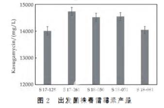將不同批次的發酵罐中篩選到的具有遺傳多 樣性的菌株作為出發菌株,利用小金色鏈霉菌(S. microaureus)分離平 板 篩 選 到 了 到5株 遺 傳 差 異 大的菌株,分別為 S17-128,S17-261,S18-050,S 18-051,S18-081,這5株菌株作為 Genomeshuff- ling的出發菌株.產量最高的菌株S17-261的春雷 霉素產量為14738mg/L,見圖2所示。