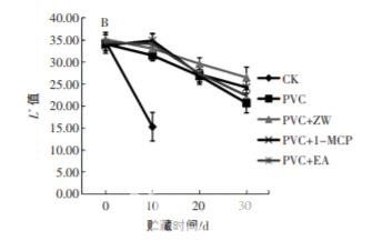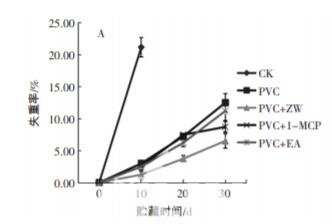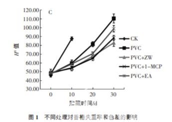 3) 聚氯乙烯+紫外照射組(PVC + ZW 組),在 PVC 膜包裹 的條件下,每隔 10 d 紫外照射 1 次,燈管功率為 40W, 強(qiáng)度為 375 μW/cm2 ,時(shí)間為 10 min;4)聚氯乙烯+1-甲 基環(huán)丙烯組(PVC+1-MCP 組),在 PVC 膜包裹的條件 下,加入 1 包 1-MCP;5) 聚氯乙烯+乙烯吸收劑組 (PVC + EA 組),在 PVC 膜包裹的條件下,加入 1 包 EA。所有處理組均置于溫度為(1±0.5)℃,濕度為(90± 5)%的冷庫(kù)中貯藏,設(shè)置 3 次重復(fù),取樣時(shí)間分別為 0、10、20 d 和 30 d。