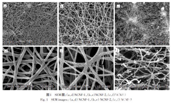 圖1為NCNFs的SEM圖。由圖1(a)和圖1(b) 可以看出,纖維的表面光滑,纖維的直徑大小比較 均一,平均直徑為 160 nm,纖維未出現(xiàn)珠結(jié)狀結(jié)構(gòu),說明質(zhì)量分?jǐn)?shù)8%的PAN紡絲溶液可紡程度較 高。圖1(c)和圖1(d)是PAN/PVP(PAN和PVP的質(zhì)量比為2∶1)基NCNFs,纖維的平均直徑為150 nm, 與只加入PAN的溶液相比,纖維變得粗糙,表面出 現(xiàn)大量的裂紋和孔隙,主要是由于PVP 在高溫下 分解產(chǎn)生大量的CO2和CO等氣體,使得纖維上產(chǎn) 生裂紋和孔隙。圖1(c)和圖1(d)中還可以看到少 量斷裂的纖維,說明產(chǎn)生的裂紋和孔隙還影響 了纖維的脆性,使得纖維變得容易斷裂。圖1(e) 和圖1(f)是KOH活化處理后的NCNFs,纖維變得 彎曲緊密和粗糙,并且大量的斷裂,很難維持纖維 原有的形貌。主要是由于KOH的處理過程中與碳 纖維發(fā)生氧化還原反應(yīng),拓展了因加入 PVP 后 NCNFs 形成的孔洞,少量的 K 單質(zhì)插入碳層中使 得碳層膨脹,導(dǎo)致NCNFs 的纖維出現(xiàn)大量斷裂的現(xiàn)象。