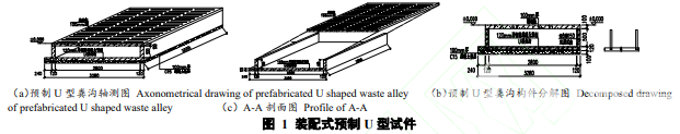本文試驗設計并制作了 2 組裝配式預制結構體系共 10 個,包括 U 型裝配式預制構件和 V 型裝 配式預制構件兩種形式的等比例試件,每結構體系均由 3 個預制構件現場拼裝完成。 其中 U 型試件尺寸如圖 1 所示。外形平面尺寸為 3.0 m×3.28 m,高 0.62 m,A-A 橫截面積為 0.51 m2,體積為 1.54 m3,單個構件凈重 3.93 t。表面做掃毛處理,以提高預制構件與滿足使用工藝要求 的金剛砂面層之間的粘結能力。