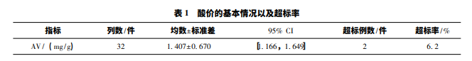 根據表 1 的結果,在 32 件實驗樣品中,樣品合 格數為 30 件,樣品合格率為 93. 8%,不合格樣品的 酸價分別為: 3. 1mg / g 和 3. 2mg / g。