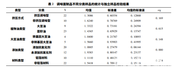 通過對樣品分類統計和分別進行獨立樣品 t 檢驗 得到如下表 2,包括按產品制作方式、原料用油種類、 原料用油的轉基因與否、添加抗氧化劑與否及包裝質 地為鋁箔材料與否 5 方面進行分類分析,并統計了各組分類的觀測量個數、平均數、標準差和平均數的標 準誤差。其中僅有添加抗氧化劑類型的分析檢驗 sig< 0. 05,所以表明調味面制品的酸價值的大小與抗氧化 劑的添加與否有顯著差異,其余均無顯著差異。
