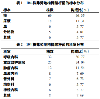 104 株弗勞地枸櫞酸桿菌臨床分離株,69 株來源于痰標(biāo)本 ( 66. 3% ) ; 其次為尿液 18 株( 17. 31% ) 、血標(biāo)本 6 株 ( 5. 77% ) 、分泌物 5 株。科室分布中排名前 3 位的科 室為呼吸內(nèi)科 32 株( 30. 77% ) 、重癥監(jiān)護病房 25 株 ( 24. 04% ) 、腫瘤內(nèi)科 12 株( 11. 54% ) 。見表 1、2。