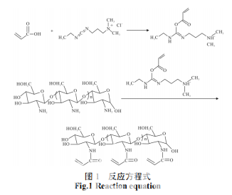 首先,在室溫下向 500 mL 的四口燒瓶中加入 0.895 g 丙烯酸和200 mL 二次蒸餾水,待其完全溶解, 再加入 2 g 殼聚糖,放入轉子。開啟集熱式磁力加熱 攪拌器,打開攪拌按鈕,設置轉速為 3~4 r/min,攪拌 20 h。安裝實驗裝置,在室溫下,將 2.619 g EDC 溶于 50 mL 的二次蒸餾水中,然后向500 mL 四口燒瓶中加入 依次預先備好的殼聚糖和丙烯酸溶液、溶解好的 EDC 溶液,開啟置頂式攪拌器,設定攪拌速度為 200 r/min, 將四口瓶移入 25 ℃的恒溫水浴鍋內,然后通入高純 度的氮氣,排除體系內的氧氣,密閉反應體系,幵在 此條件下反應 2 h。反應結束后,將得到的液體迚行透 析,透析一周,前 3 天一天換三次水,后 4 天一天換 兩次水。乊后迚行測試觀察結果,即得到丙烯酰化殼 聚糖,可以迚行下一步反應。反應方程式如圖 1 所示。